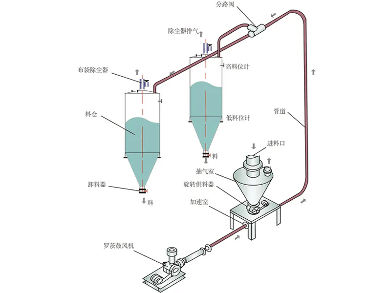氣力輸送系統(tǒng)的工作原理是,利用羅茨風機產(chǎn)生的正壓氣流作為輸送動力,帶動物料在氣力輸送管道內(nèi)運輸,從而確保物料能順利到達后續(xù)的儲料倉中.