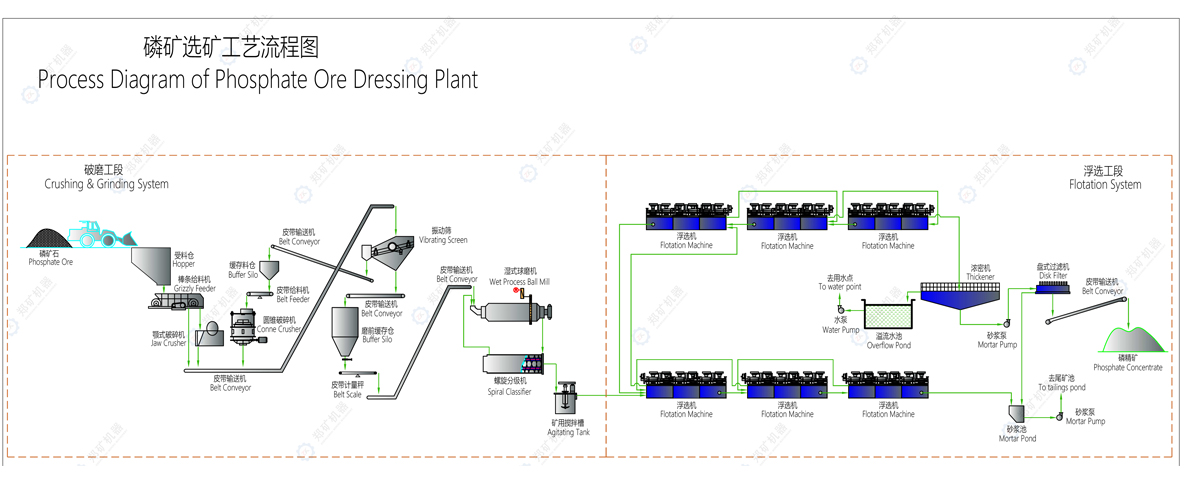在對(duì)于磷元素的提取過程中,我們需要將大塊的磷礦石破碎、研磨成細(xì)粉,因此在選礦的過程中,就需要使用破碎機(jī)和球磨機(jī)這兩種類型的設(shè)備。研成粉末以后的磷礦由于磷礦石可浮性都比較高,還需要借助浮選機(jī)等進(jìn)行選別,由此可知:磷礦石選礦流程主要包括:破碎篩分、磨礦、浮選、脫水、尾礦處理幾個(gè)階段。不同階段處理流程不同,使用的設(shè)備也不同,下面就來對(duì)于這些階段進(jìn)行分析。1、破碎篩分階段:這一階段主要是將大塊的磷礦破碎成小塊,破碎的時(shí)候,需要采用二級(jí)閉路或三級(jí)閉路工藝將0-350毫米的大塊磷礦破碎至15毫米以下的小顆粒物料,然后才能進(jìn)行后續(xù)的粉磨作業(yè),這一階段的篩分作業(yè),主要是為了保證破碎后的磷礦石顆粒均勻且都符合15毫米以下的要求;